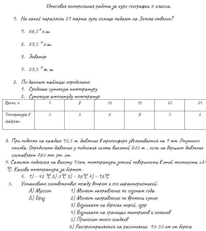 Знаю только на 2 ответ. Средняя суточная температура-4 градуса. Суточная амплитуда температур-8 градусов. Третье не уверена:741 градус у подножия. 5.Муссоны-Меняет направление по сезонам года. Бриз-меняет направление по времени суток.