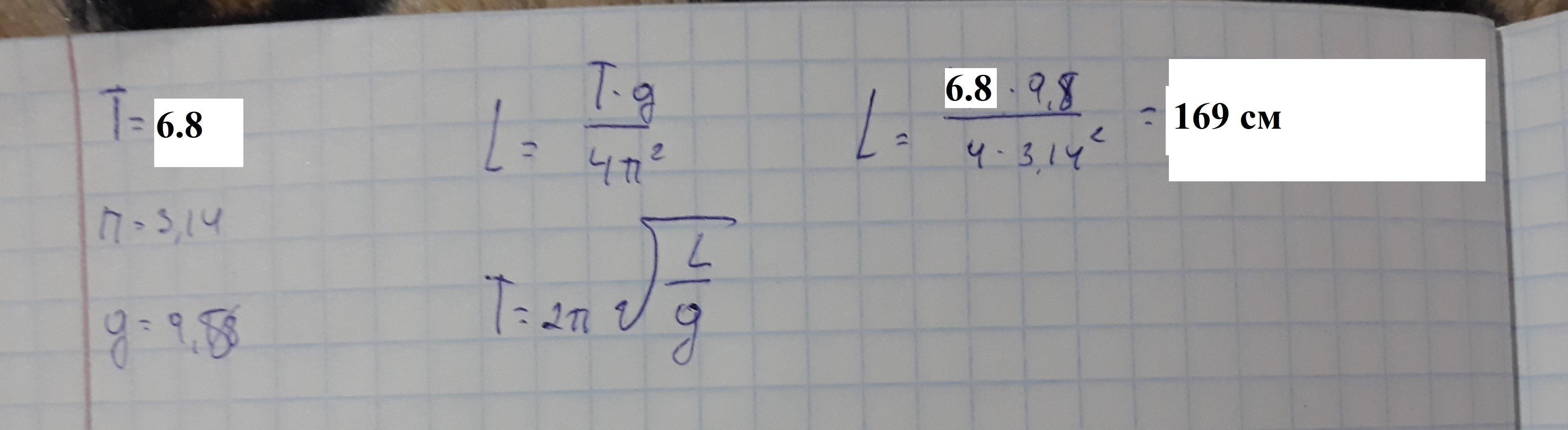 Определить длину математического маятника с периодом колебаний 6.8с. При расчетах прими П=3.14; g=9.8m/c в квадрате.