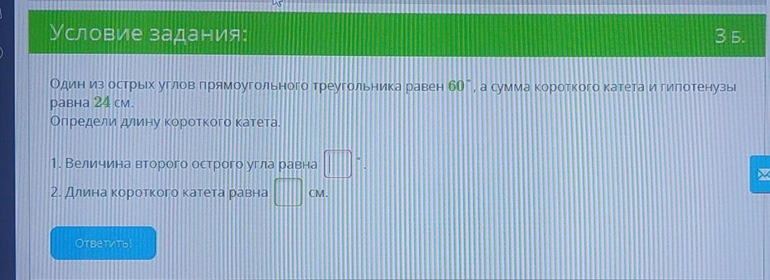 Мы знаем, то что напротив угла в 30° лежит сторона(катет) равный половине гипотенузы, следовательно, обозначим катет за х, а гипотенузу 2х. Составим уравнение, и решим: