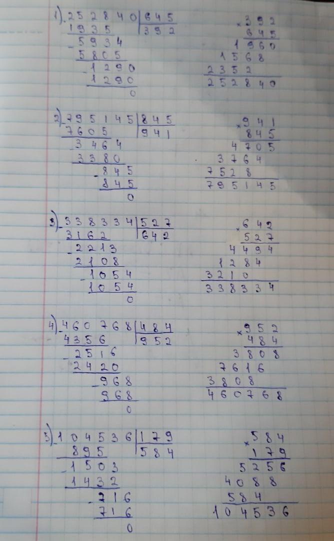 Помогите решить примеры с проверкой столбиком 1) 252840:645 2)795145:845 3)338334:527 4)460768:484 5)104536:179