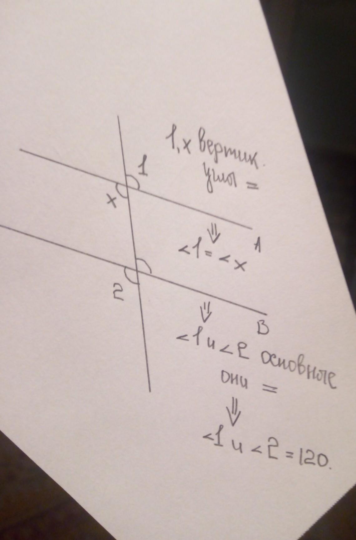 120 потому что угол 1 вертикальный с углом x => 1 и 2 односторонний и они равны => ини оба равны по 120