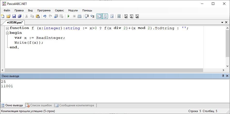 - function f (x:integer):string := x>0?f(x div 2)+(x mod 2).ToString:'';