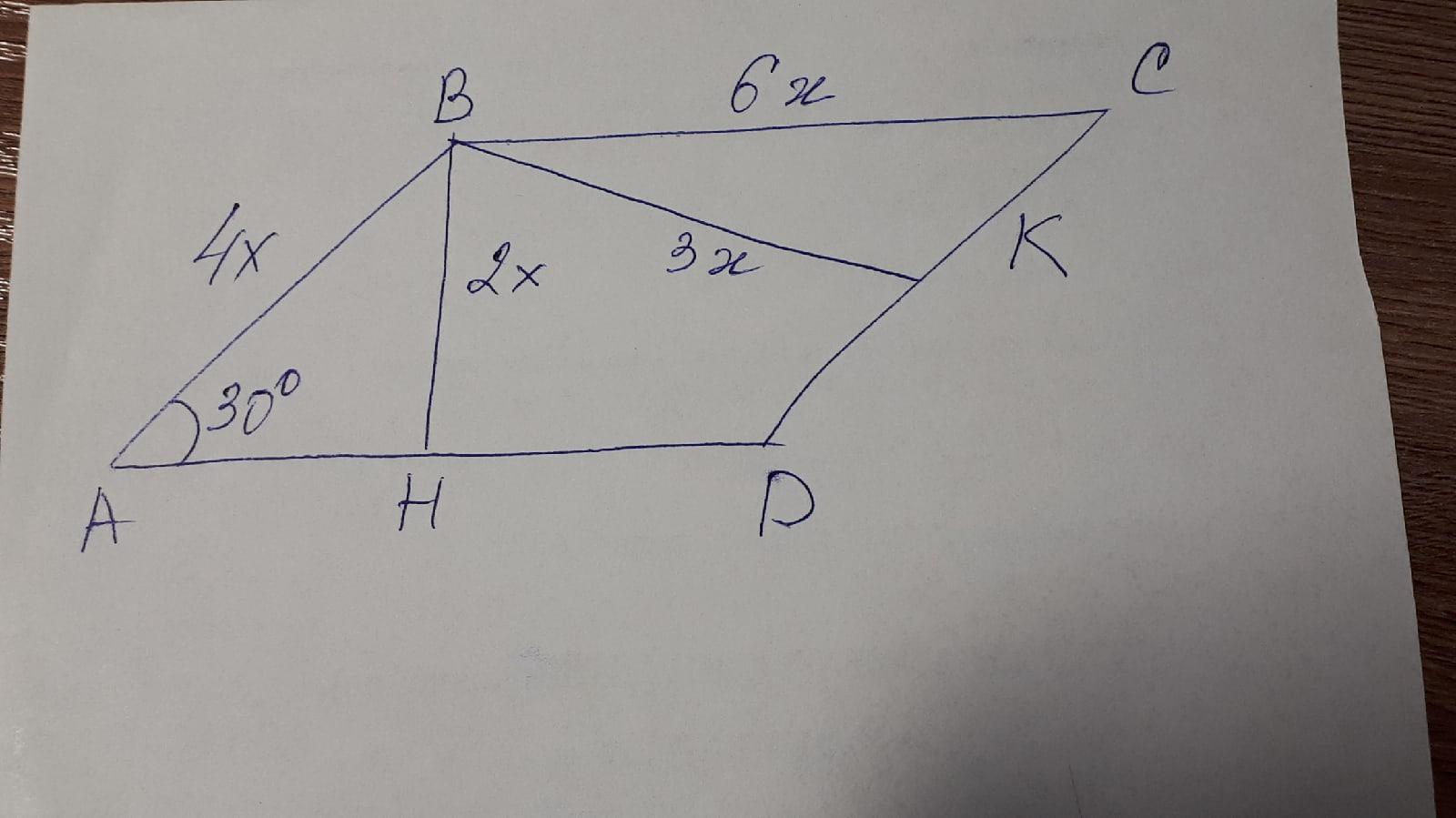 1) Примем одну высоту параллелограмма за 2х (на рисунке это сторона BH), тогда вторую высоту примем за 3х (на рисунке это сторона BK).