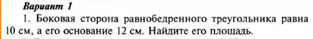S=√16(16-10)(16-10)(16-12)=√16*6*6*4=4*6*2=48 см²