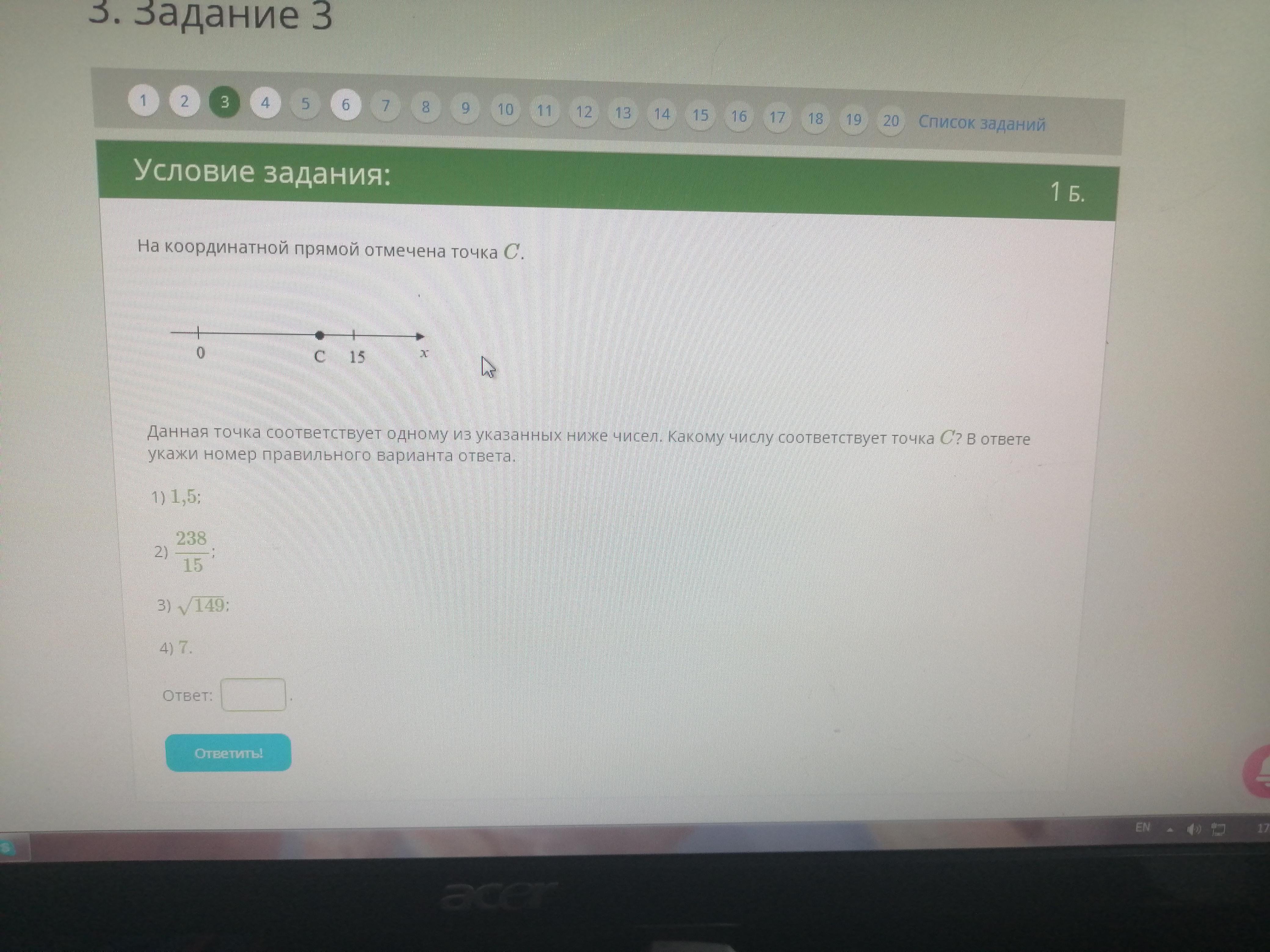 Объяснение: точно не 1,5, т к слишком далеко от 0, точно не 238/15, т к это больше 15, точно не 7, т к тогда точка находилась бы примерно посередине, остаётся корень из 149, который примерно равен 12,2, а это нам вполне подходит