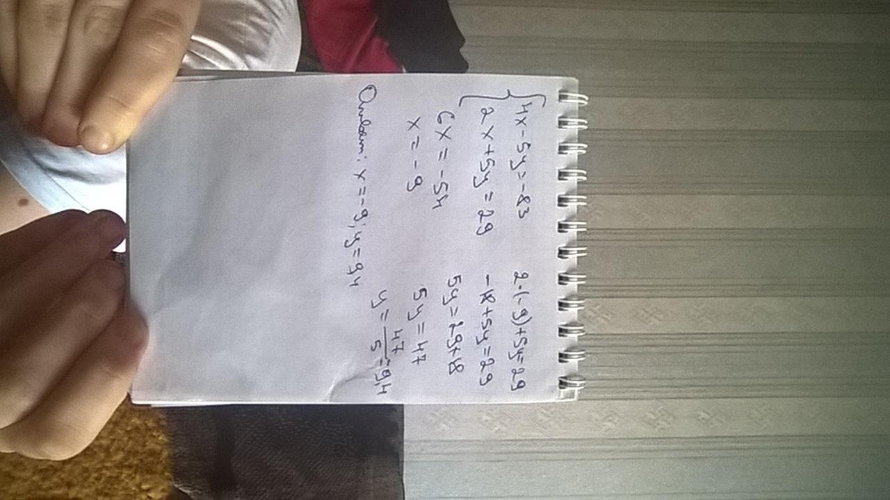 Решите методом сложения систему уравнений 4х-5у=-83, 2х+5у=29