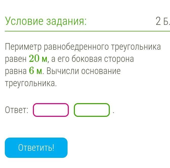 В равнобедренном треугольнике боковые стороны равны, следовательно вторая сторона тоже будет 6м. Две боковые стороны вместе 6м + 6м = 12 м. И чтобы узнать основание, из периметра надо вычесть сумму боковых сторон: 20м - 12м = 8м