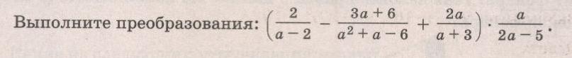 (frac{2}{a-2}-frac{3a+6}{a^2+a-6}+frac{2a}{a+3})*frac{a}{2a-5}=(frac{2a+6-3a-6+2a^2-4a}{a^2+a-6})*frac{a}{2a-5}=frac{2a^2-5a}{a^2+a-6}*frac{a}{2a-5}=frac{a^2}{a^2+a-6}