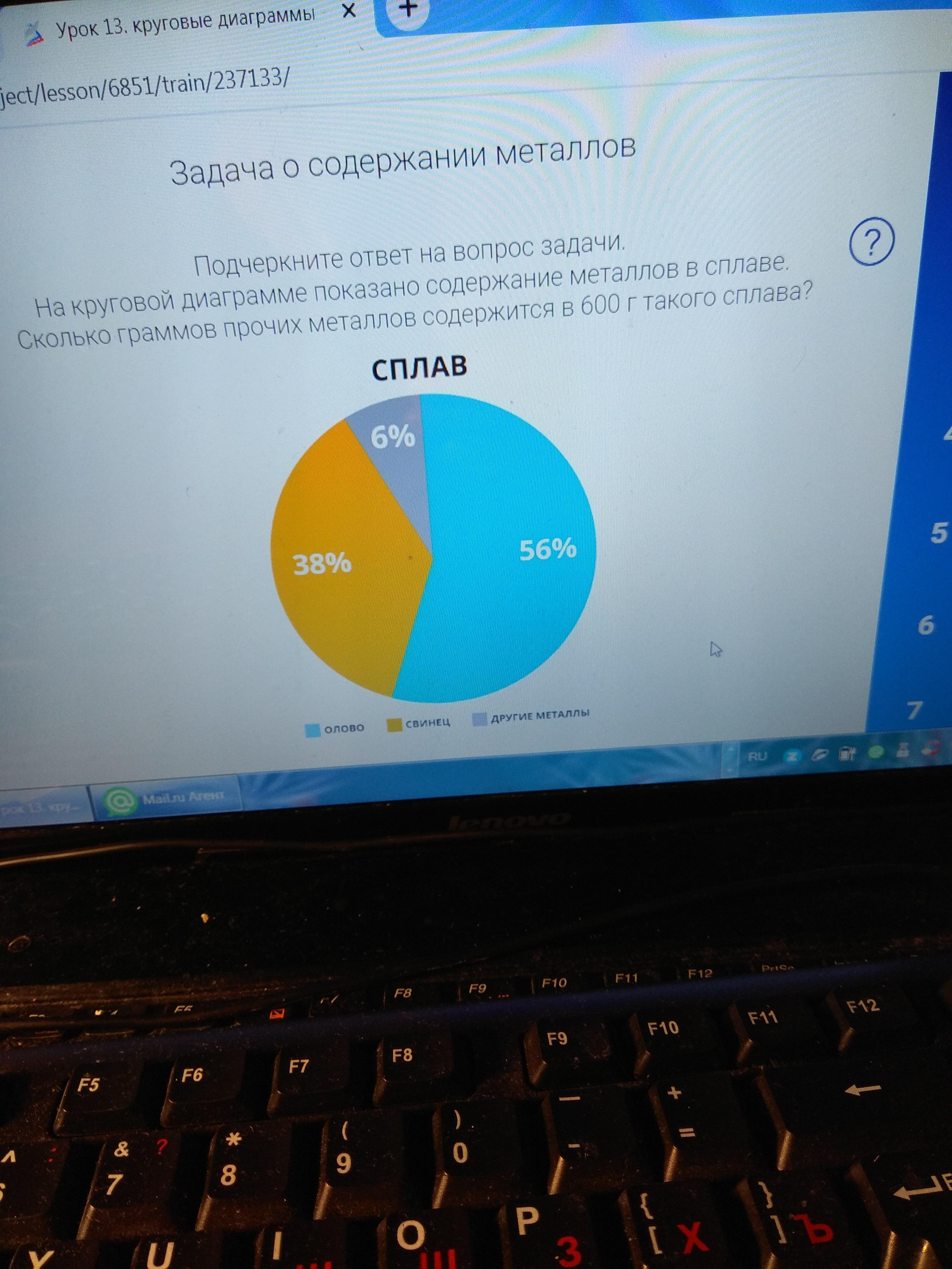 2) 6 * 6 = 36 (г) - прочих металлов содержится в 600г сплава.