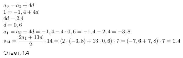 Найдите сумму четырнадцати первых элементов арифметического прогрессии (аn), если а5= - 1,4 а9=1. Спасибо заранее.....с меня баллы
