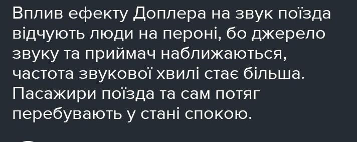 Поїзд подає звуковий сигнал, проїжджаючи повз залізничну станцію, на пероні якої стоять люди. Хто відчує вплив ефекту Доплера на звук поїзда:люди на пероні чи пасажири поїзда? Чому? СРОЧНО