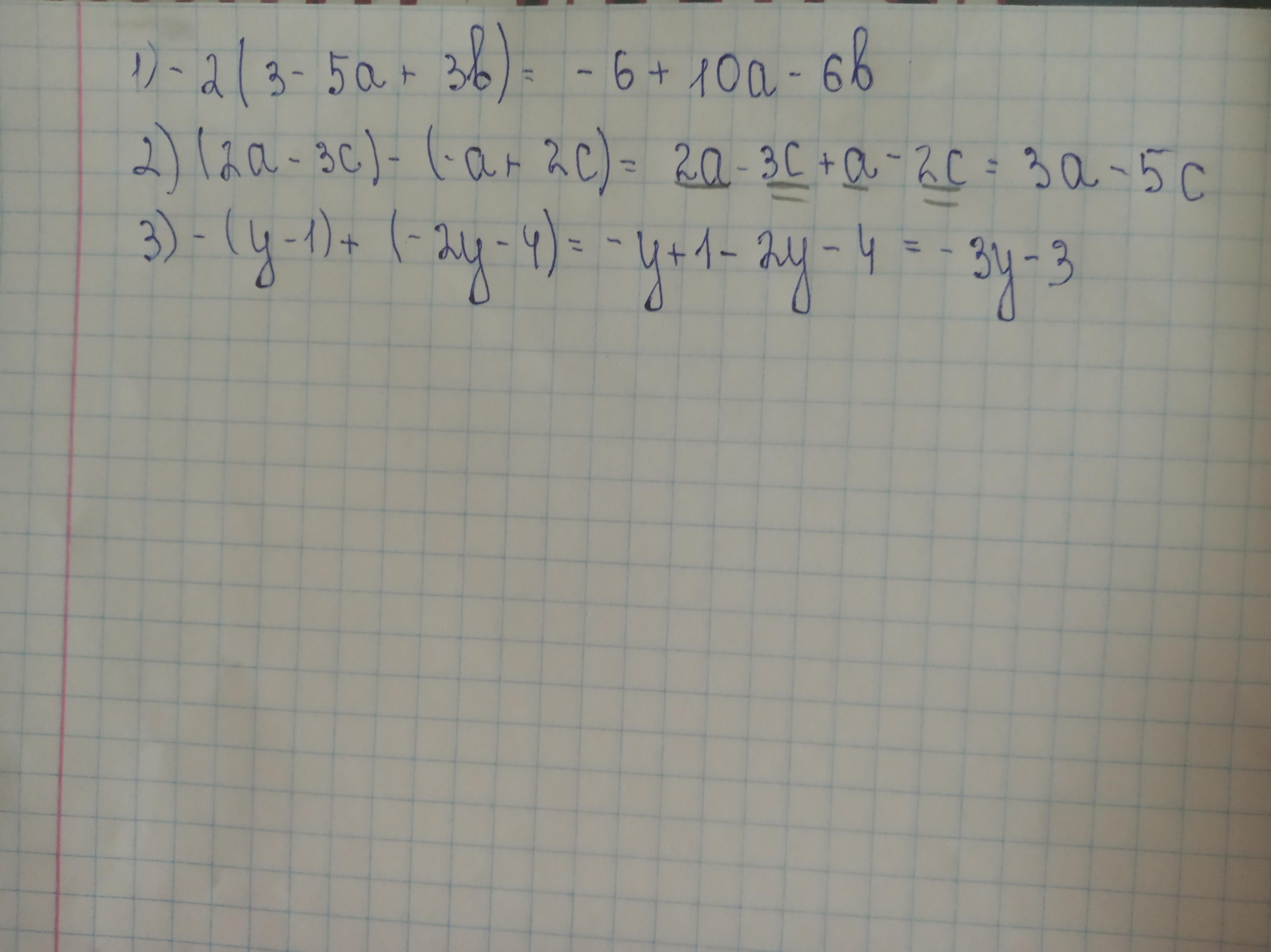 Выполните действия : 1) -2*(3-5а+3в); 2) (2а-3с)-(-а+2с); 3) -(у-1)+(-2у -4).
