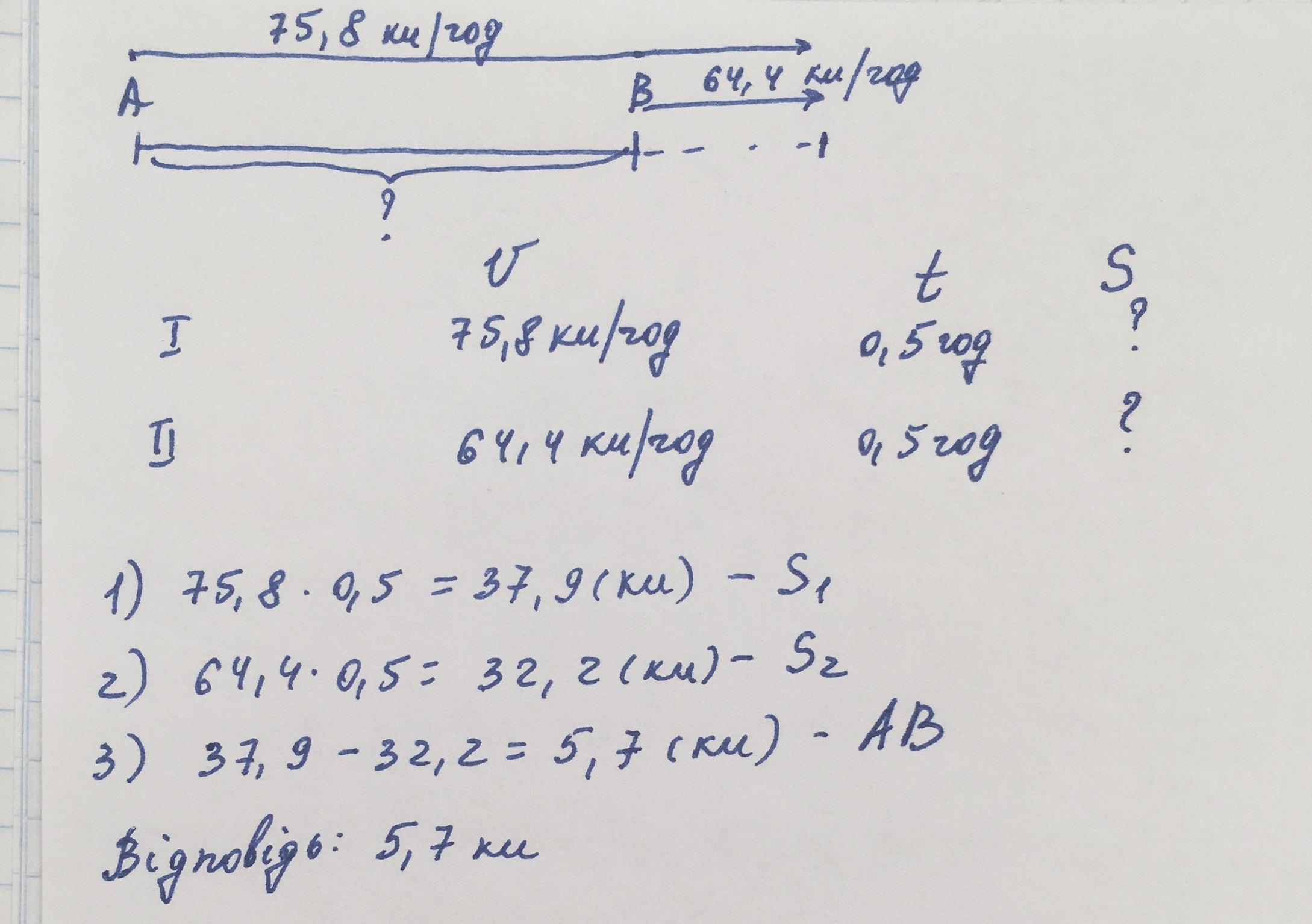 із пунктів А і В в одному напрямку одночасно виїхали два автомобілі. Автомобіль, який виїхав із пункту А, їде зі швидкістю 75,8 км/год, а швидкість автомобіля, який виїхав із пункту В і їде попереду, дорівнює 64.4 км/год. Автомобіль, який виїхав із А, наздогнав другий автомобіль через 0.5 години. Яка відстань між пунктами А і В