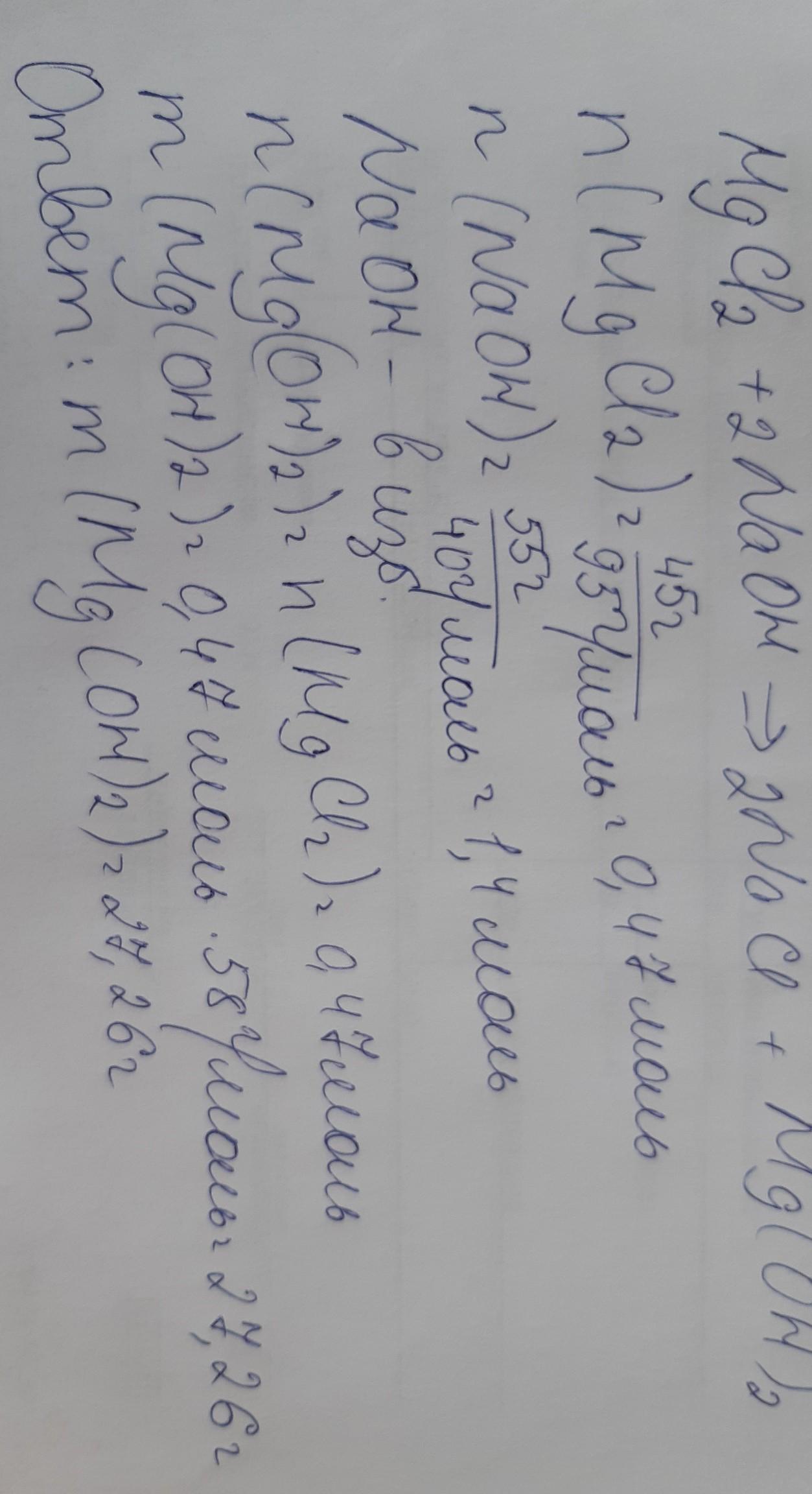 Решить задачу: вычислить массу осадка, который образуется при взаимодействии 45г хлорида магния с 55г гидроксида натрия.