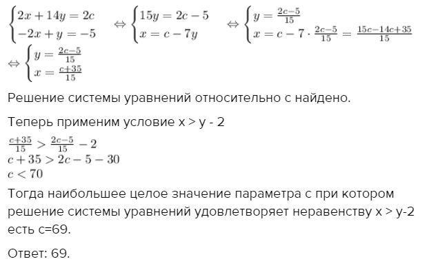 Тогда наибольшее целое значение параметра с при котором решение системы уравнений удовлетворяет неравенству x > y-2 есть с=69.