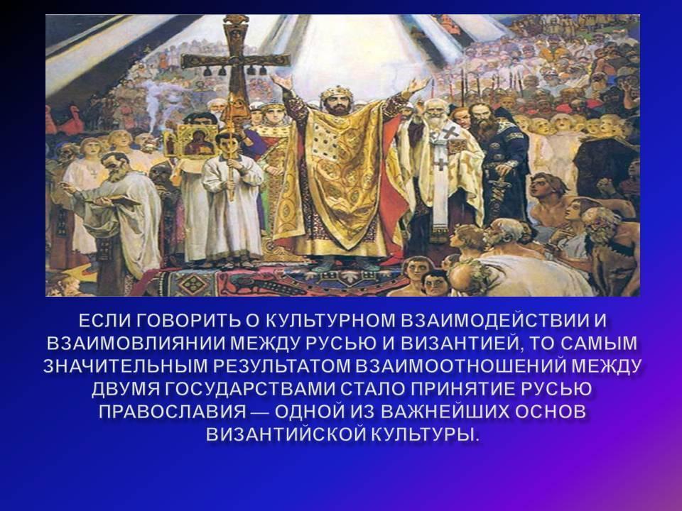Ответить на вопросы: Когда началось культурное взаимодействие между Русью и Византией (в какой из периодов развития культуры)? Что переняла Русь от Византии, а что осталось своего национального, не подвергшегося влиянию христианства?