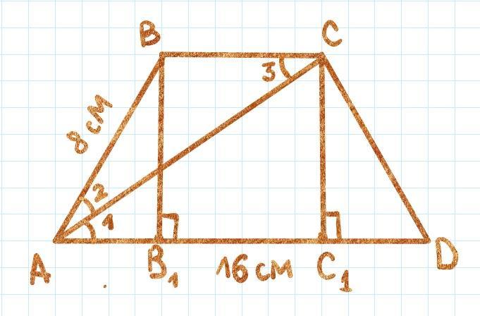 Більша основа рівнобічної трапеції =16см бічна сторона =8см Діагональ трапеції ділить її гострий кут навпіл Знайдіть площу трапцеції