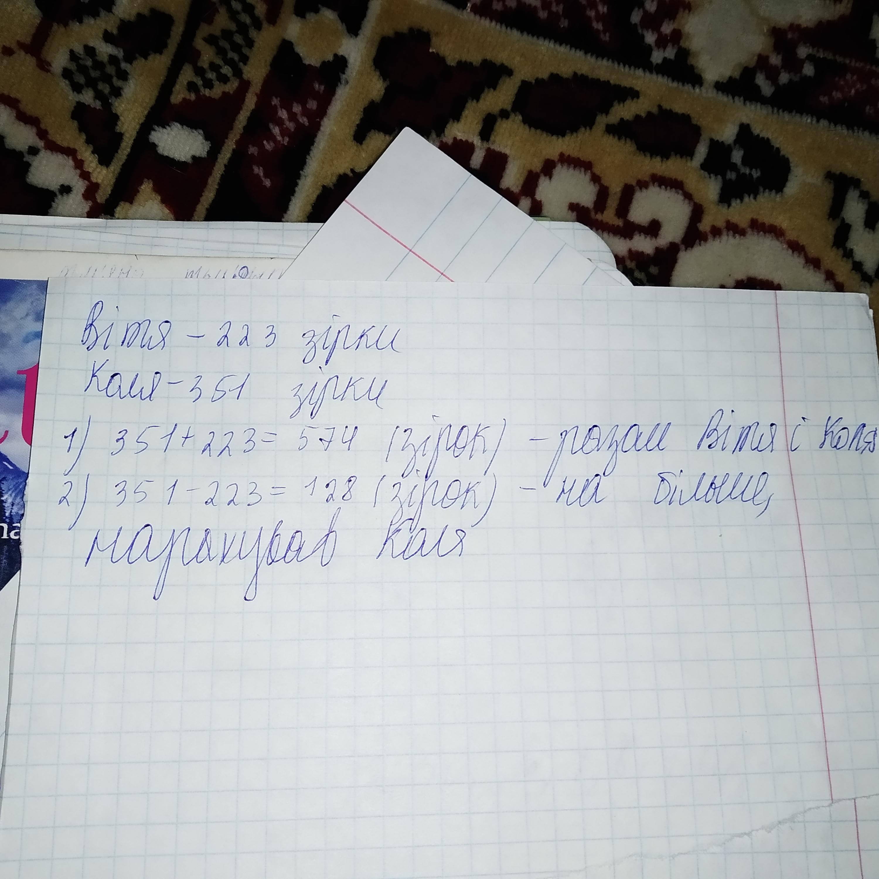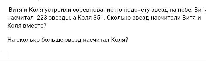1)...223+351=574 (звезды насчитали вместе Коля и Витя.)