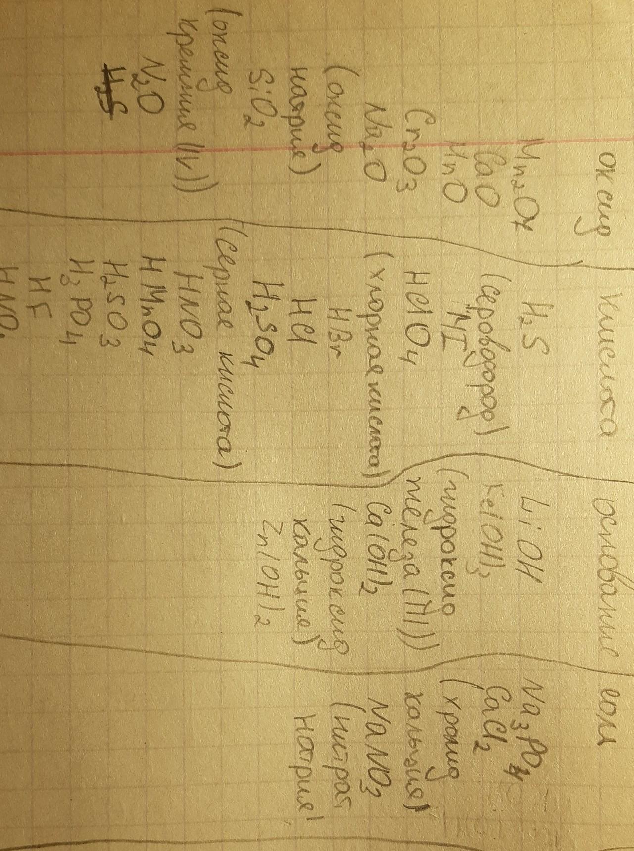 2: кислоты — HClO4, HCl, H2SO4, HNO3, HMnO4, H2SO3, H3PO4, HNO2, H2CO3, H2S, H2SiO3, HBr, HF, HI