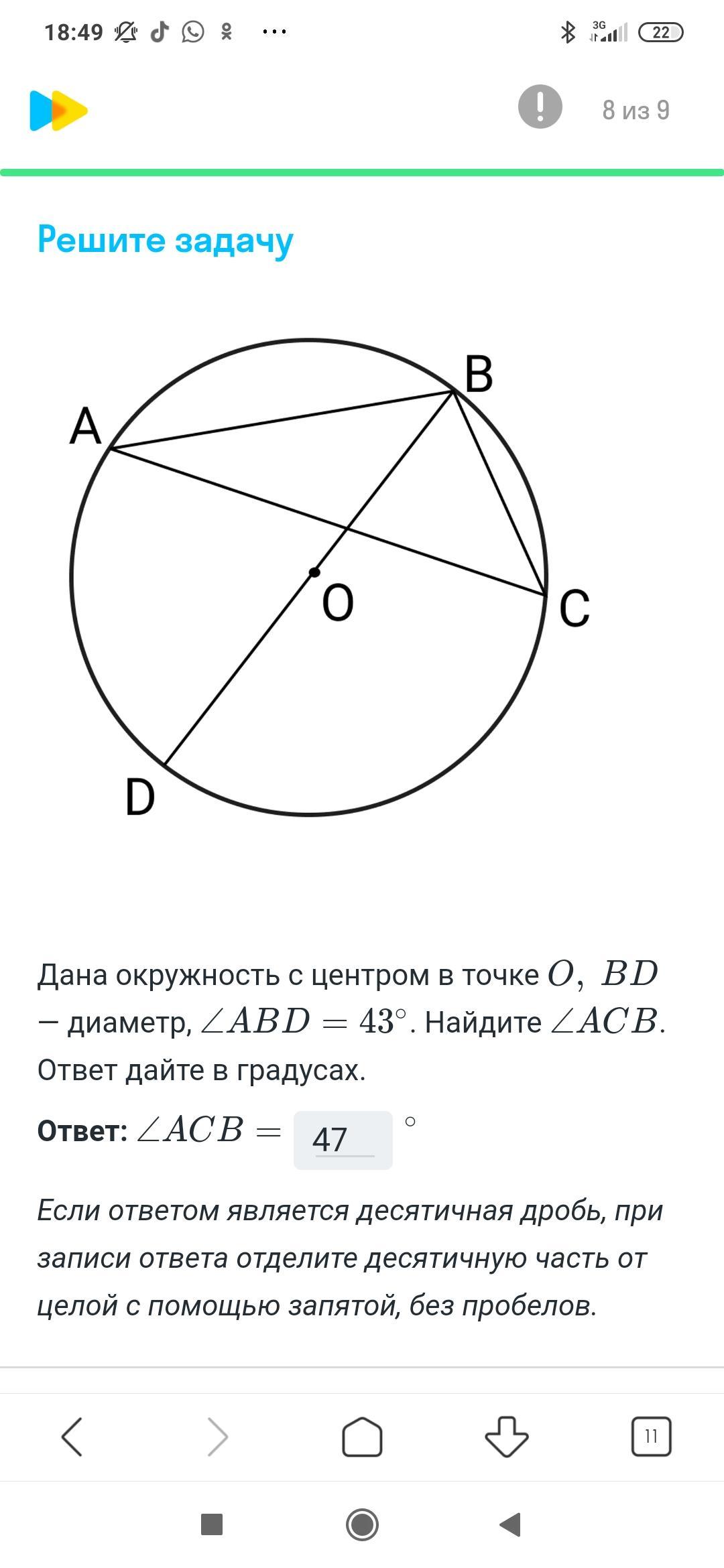 ∠ABD=43°. Он является вписанным углом окружности. Значит, дуга AD=43°*2=86°. DB-диаметр⇒ дуга DB=180°.