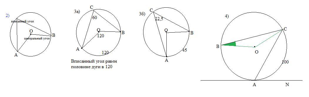 3.А) Постройте центральный угол 120 градусов и дополните рисунок вписанным углом, опирающимся на эту дугу и найдите градусную меру вписанного угла. ( в приложении)