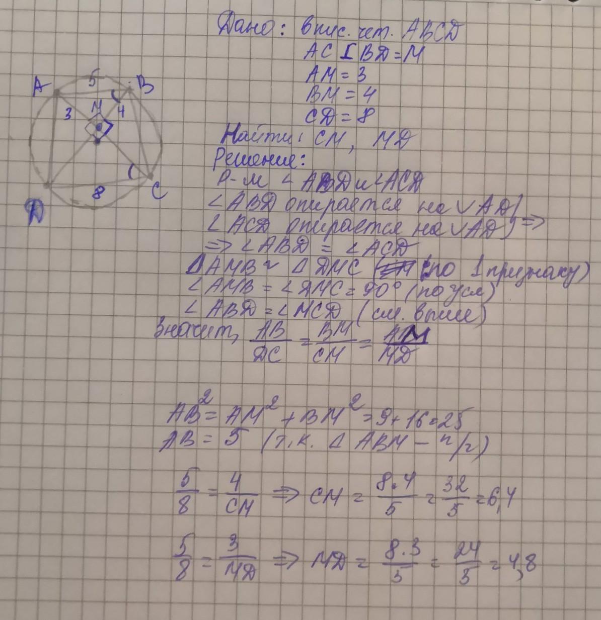 Диагонали AC И BD вписанного в окружность четырех угольника ABCD взаимно перпендикулярны и пересекаются в точке М . Известно . что АМ =3 , МС = 8 и DM = 4 . Найдите ВС. СРОЧНО РЕБЯТАААААА!!!!!!!!!!!!!!!!!!!!!!!!!! В замен дам 20 баллов .