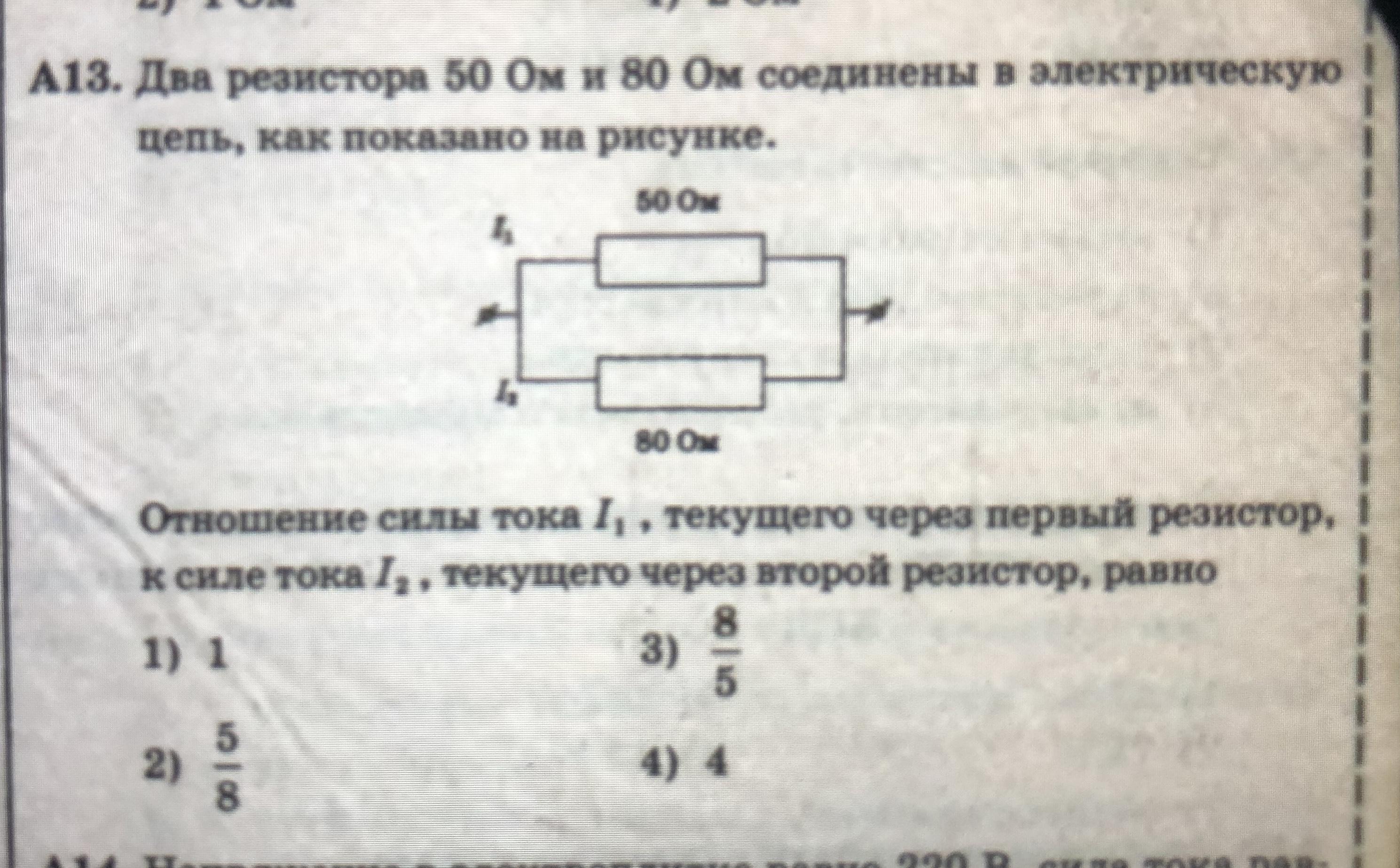 Два резистора 50 Ом и 80 Ом соединены а электрическую цепь,как показано на рисунке. Отношение силы тока l1,текущего через первый резистор, к силе тока l2, текущего через второй резистор равно: