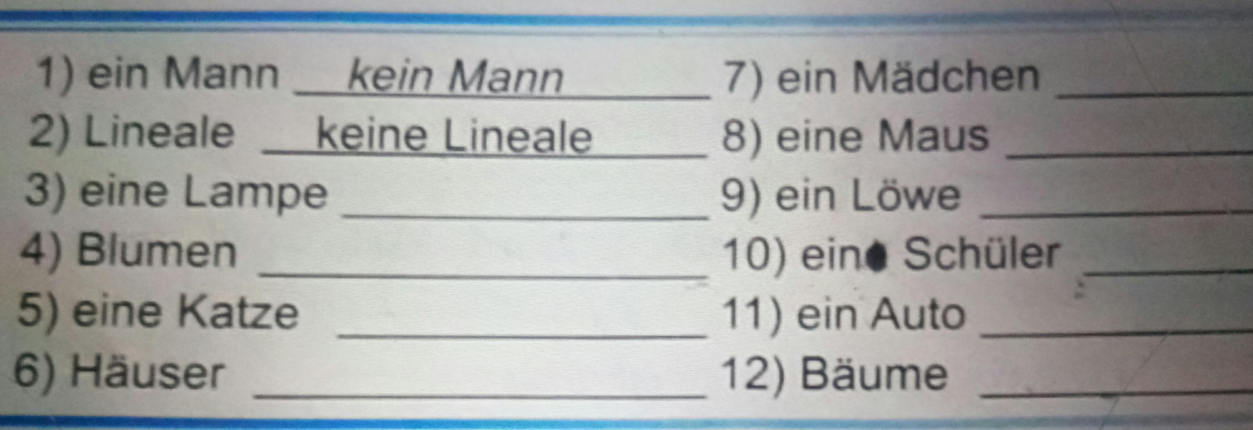 пожалуйста. Превратите утвердительные словосочетания на отрицательные, используя kein.