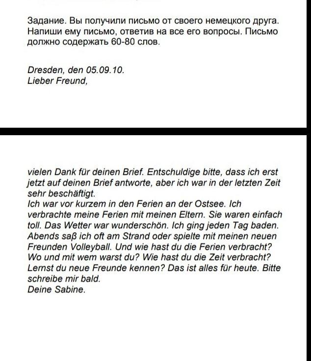 vielen Dank für deinen Brief, ich habe mich sehr gefreut! Mir geht es gut, Ich hatte tolle Sommerferien. Im Juli war ich mit meiner Familie im Gebirge. Wir sind viel gewandert. Im August war ich mit meiner Schwester am Schwarzen Meer. Wir haben im Meer gebadet und Volleyball am Strand gespielt. Ich habe neue Freunde gefunden. Ein Mädchen war auch aus Odessa. Wir treffen uns jetzt oft und verbringen gemeinsam das Wochenende.
