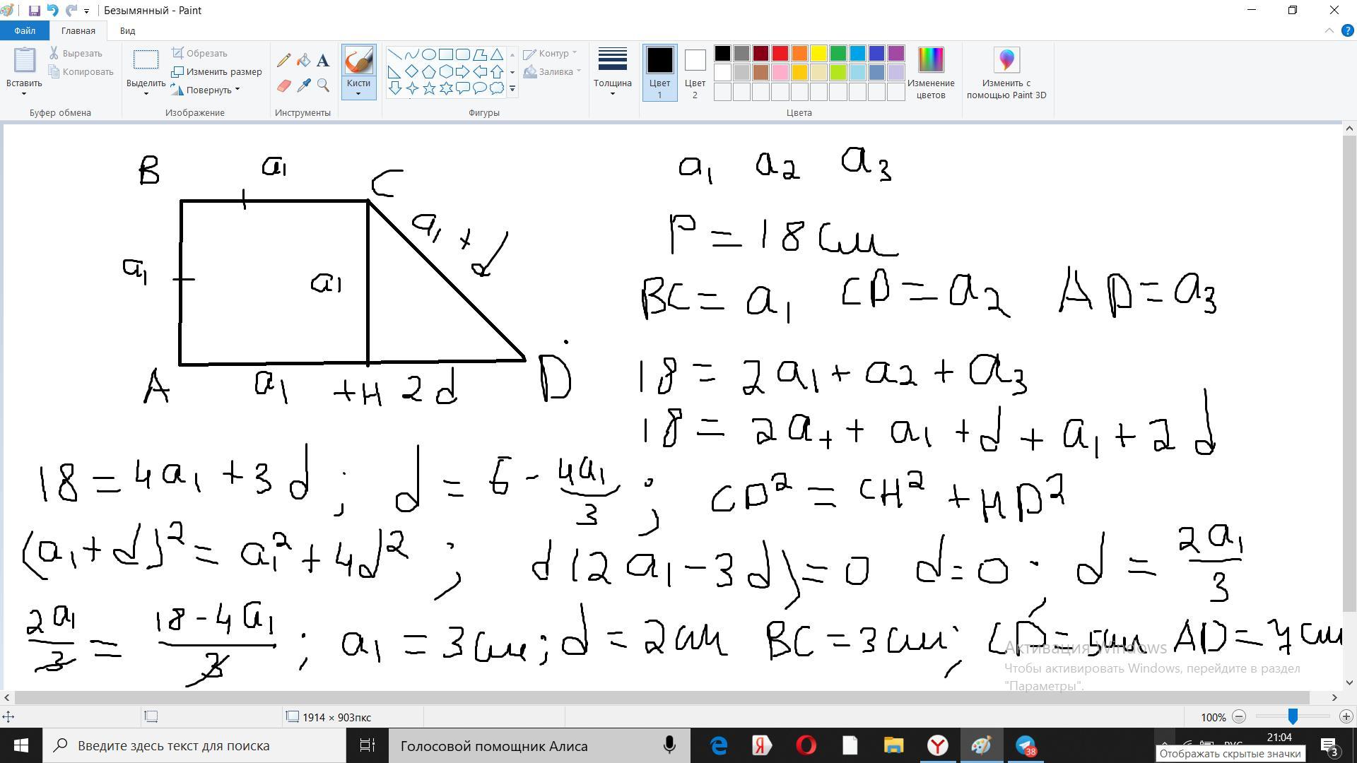 Две меньшие стороны прямоугольной трапеции равны. Три различные стороны трапеции образуют арифметическую прогрессию. Периметр трапеции равен 18 см. Какая из сторон трапеции является наибольшей? Найди все стороны трапеции.