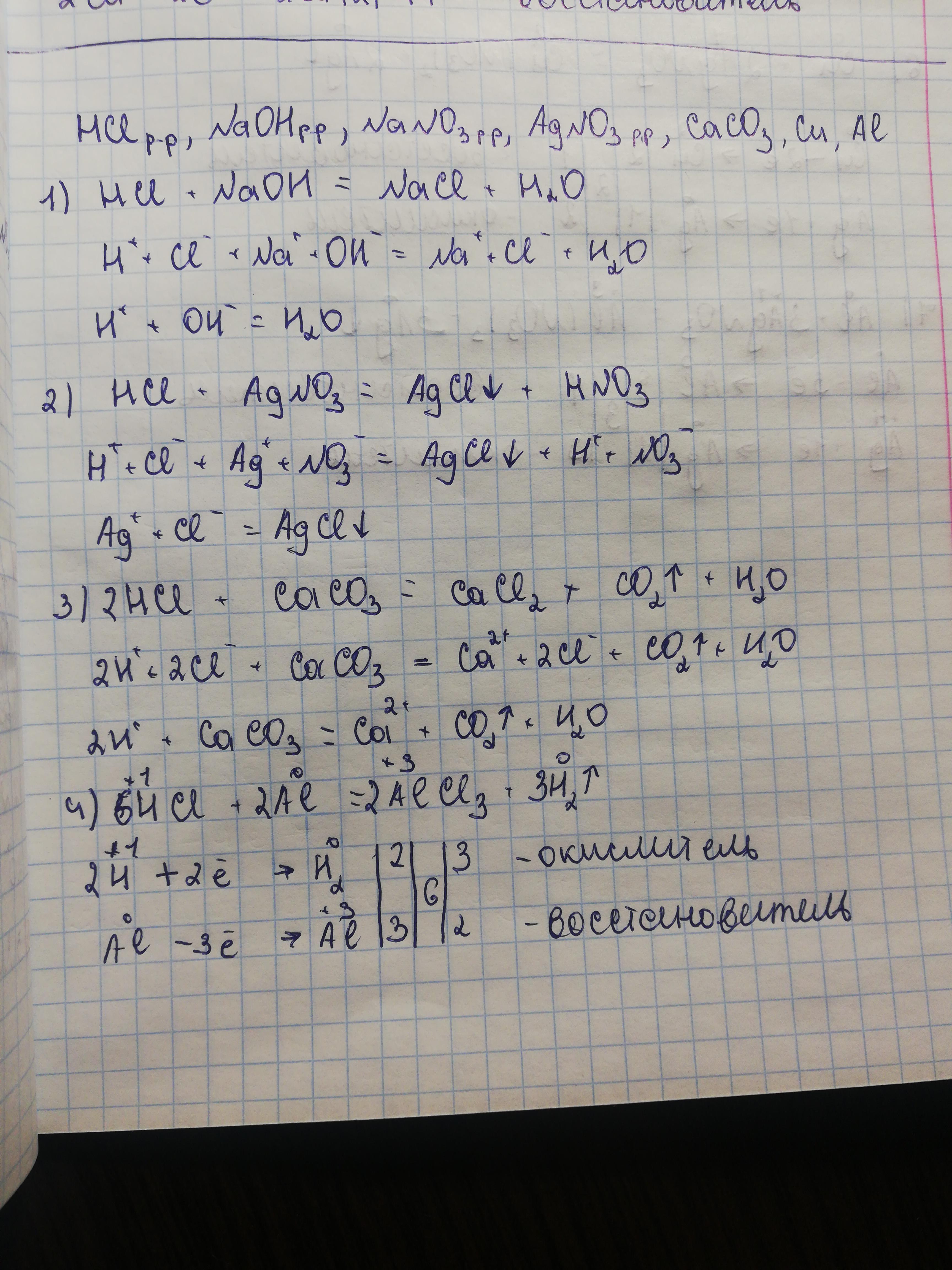 РЕБЯТА! ОЧЕНЬ НУЖНО! ПОЖАЛУЙСТА! Предложены следующие вещества: растворы соляной кислоты, гидроксида натрия, нитрата натрия, нитрата серебра, карбонат кальция, медь, алюминий.