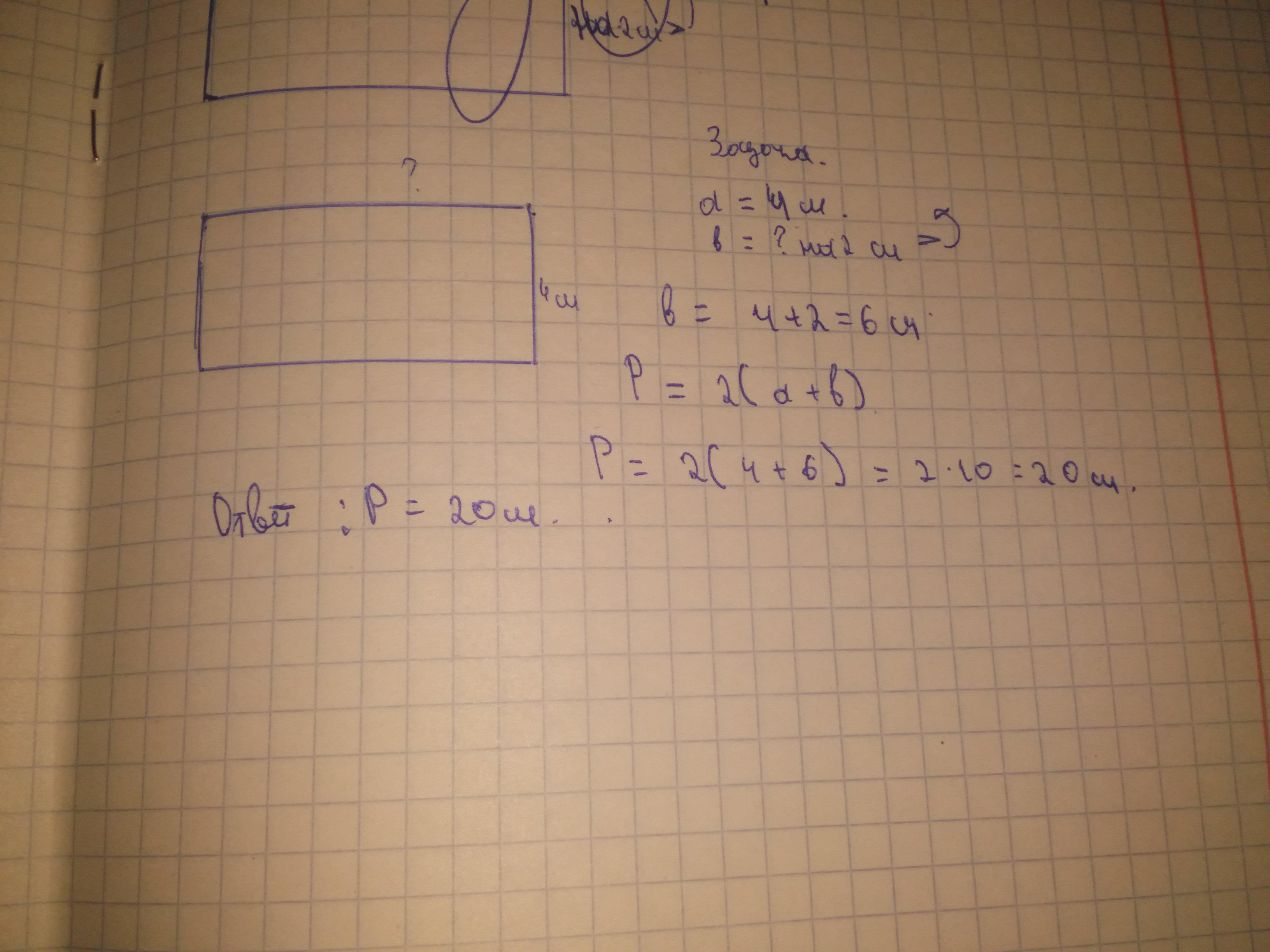 Одна сторона прямоугольника 4 см, другая – на 2 см больше. Найди периметр прямоугольника. Начерти этот прямоугольник, обозначь длины его сторон.