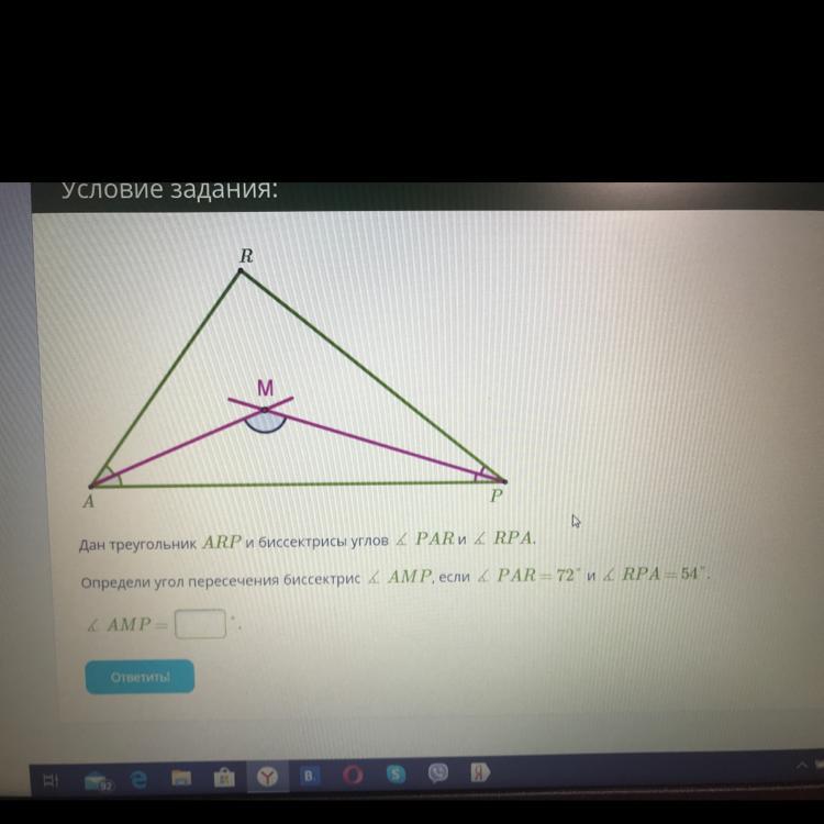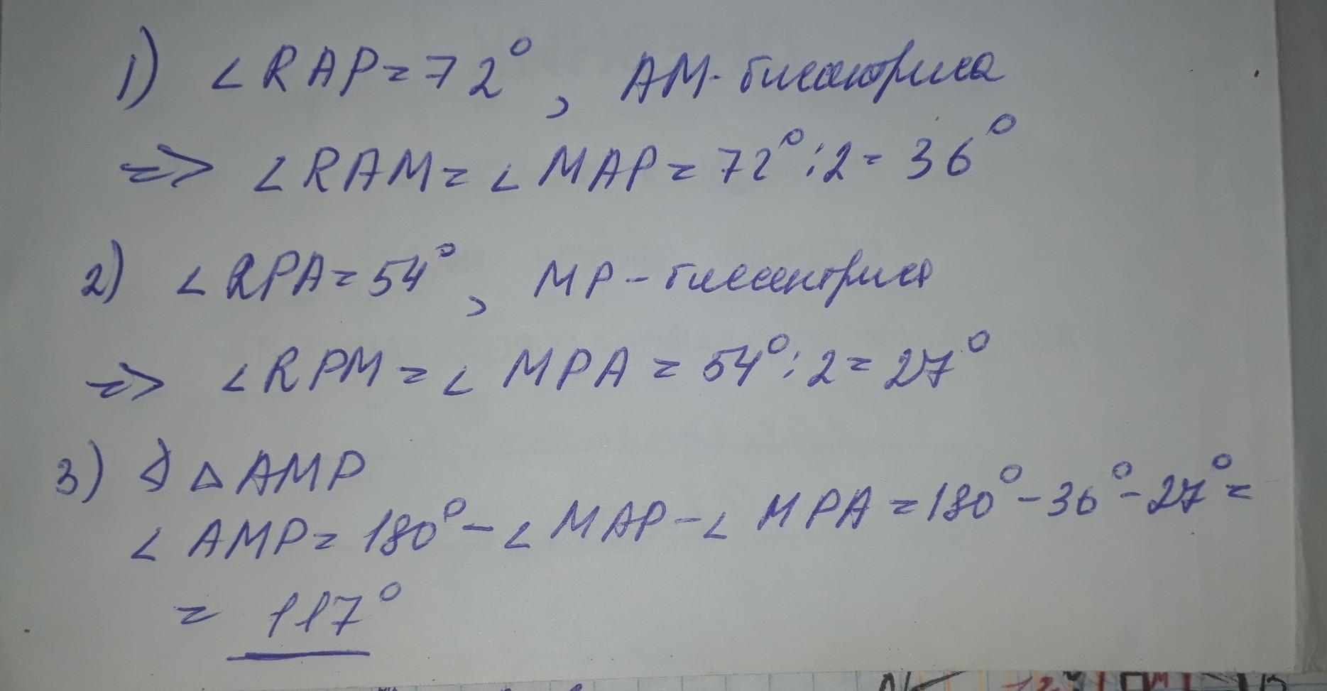 итак. унас образовался треугольник АМР. АМ и МР бисектрисы. бисектриса делит угол пополам. угол МАР =угол RAP:2=72:2=36