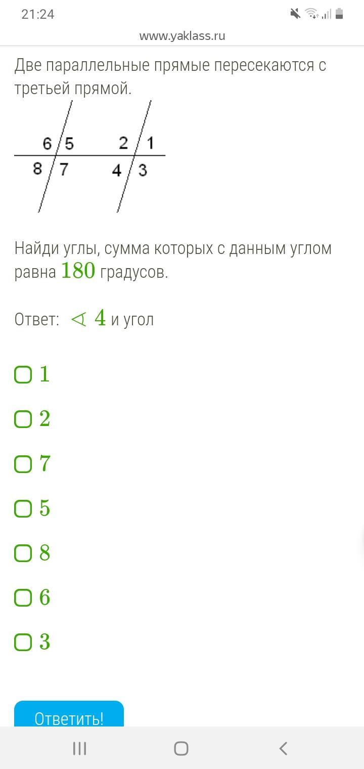 Угол 4 и 7 так как если авеню параллельные прямые пересечены секущей, то сумма односторонних углов равна 180 градусов, и углы 4 и 3 как смежные углы