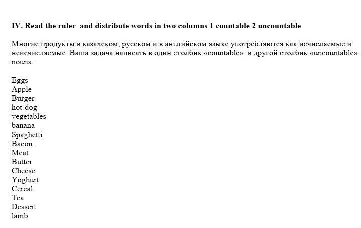 Многие продукты в казахском, русском и в английском языке употребляются как исчисляемые и неисчисляемые. Ваша задача написать в один столбик «countable», в другой столбик «uncountable» nouns. Помогите плизз)