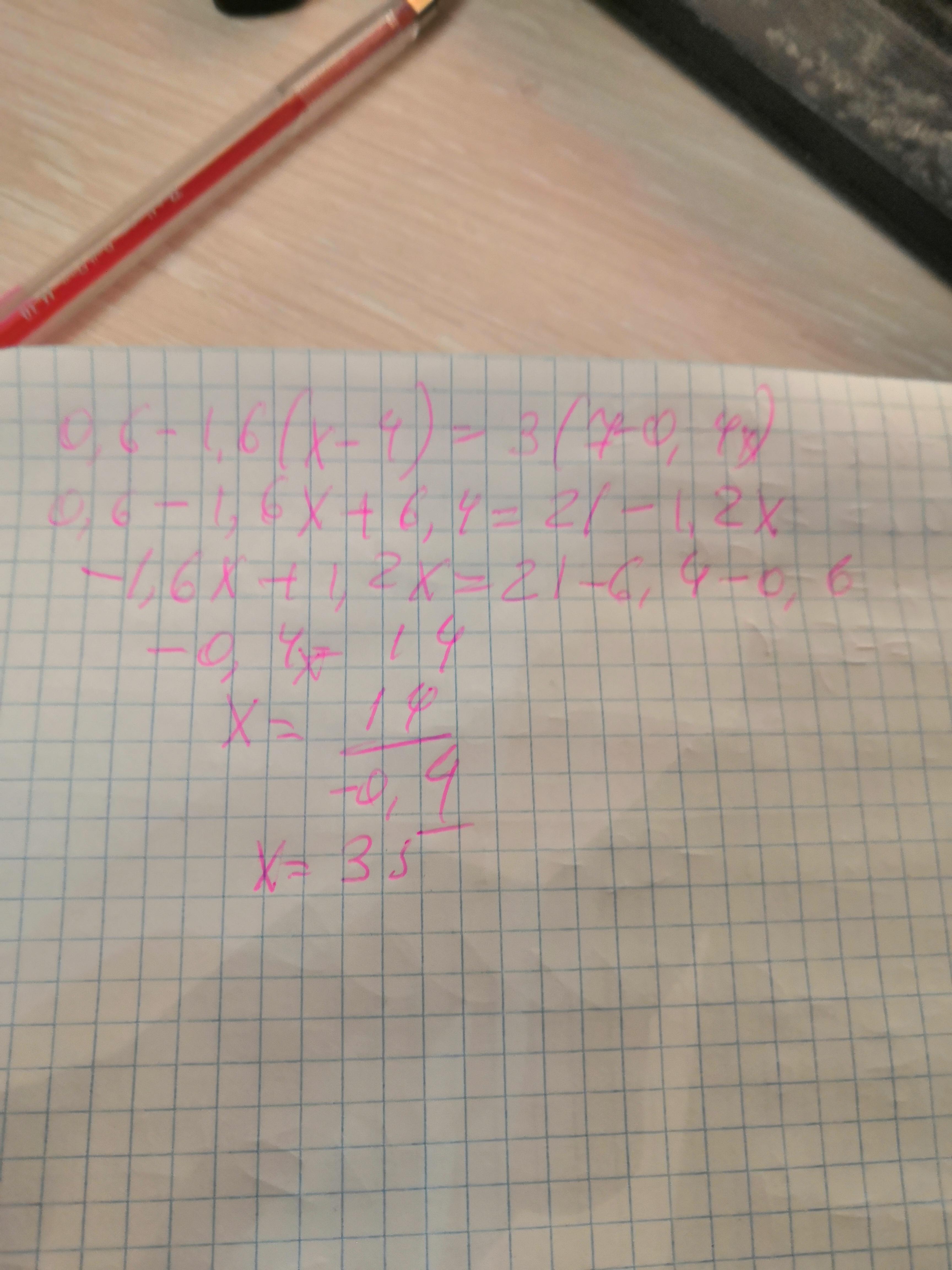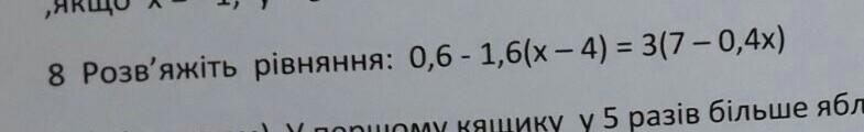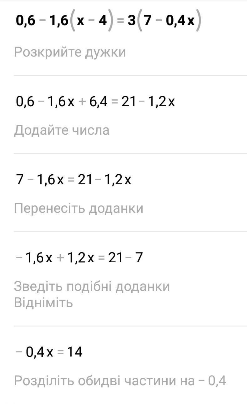 Розв'язати рівняння: 0,6-1,6•(х-4)=3•(7-0,4х)