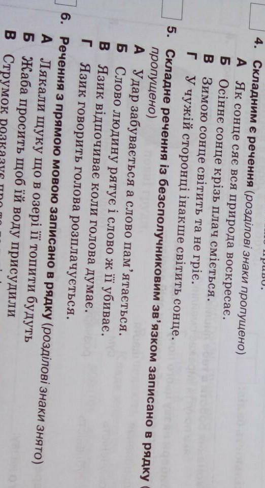 Доказую, що моя відповідь правильна. 4 завдання , відповідь А. Бо складним є речення у якого 2 граматичні основи: 1ша сонце сяє,2га природа воскресає. 5 завдання, відповідь Г. Сполучник "а" пропущений: язик говорить- голова розплачується. На його місці тире! Навіщо ти людині попсував контрольну, ще й мене звинувачуєш?