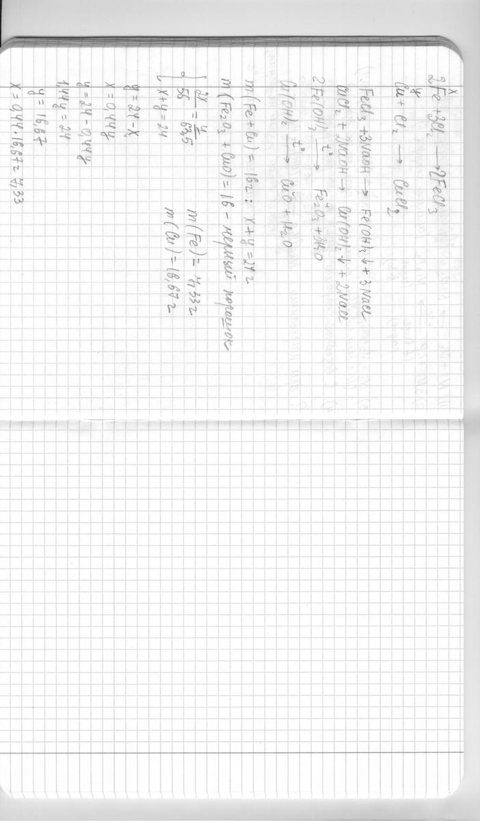 Соли, образовавшиеся при взаимодействии 24 г смеси железа и меди с хлором , обработали избытком горячего раствора щелочи. Осадок отделили, прокалили и получили 16 г черного порошка. Определите количественный состав исходной смеси