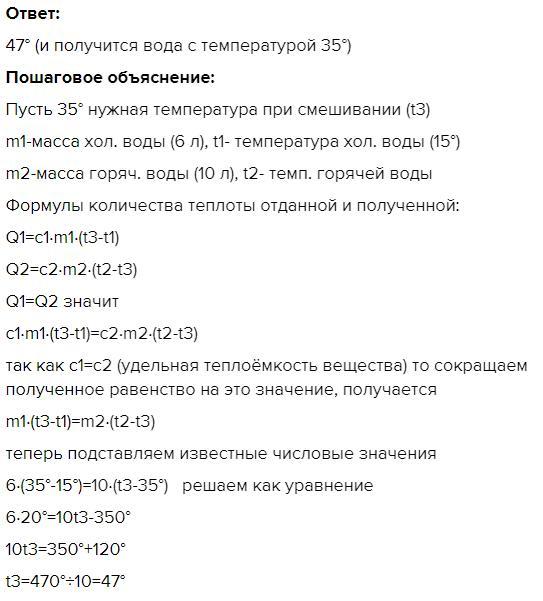 Какую температуру должны иметь 10 л воды, чтобы при смешивании их с 6 литрами 15-градусной воды получилась бы вода, температура которой больше 30 градусов ,но меньше 40 градусов