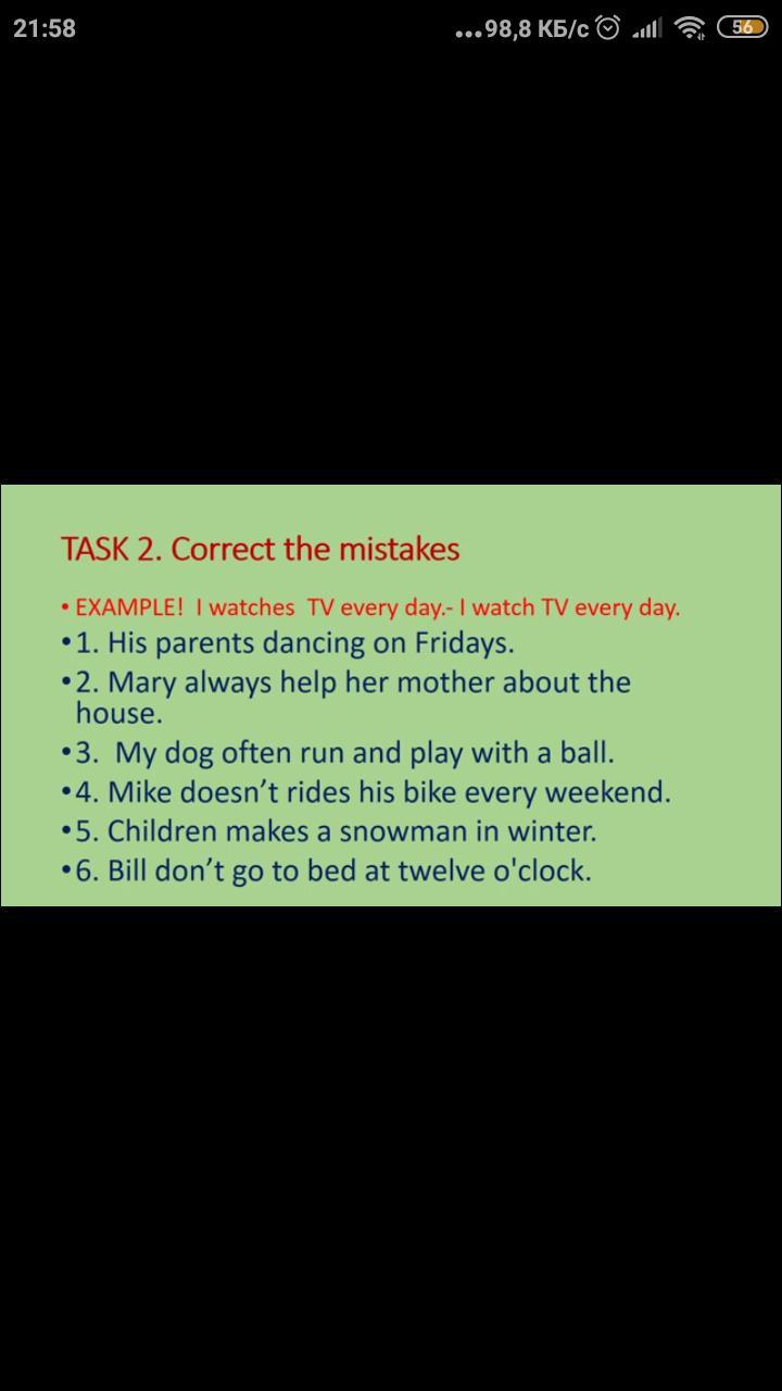 6. Bill DOESN'T go to bed at twelve o'clock.