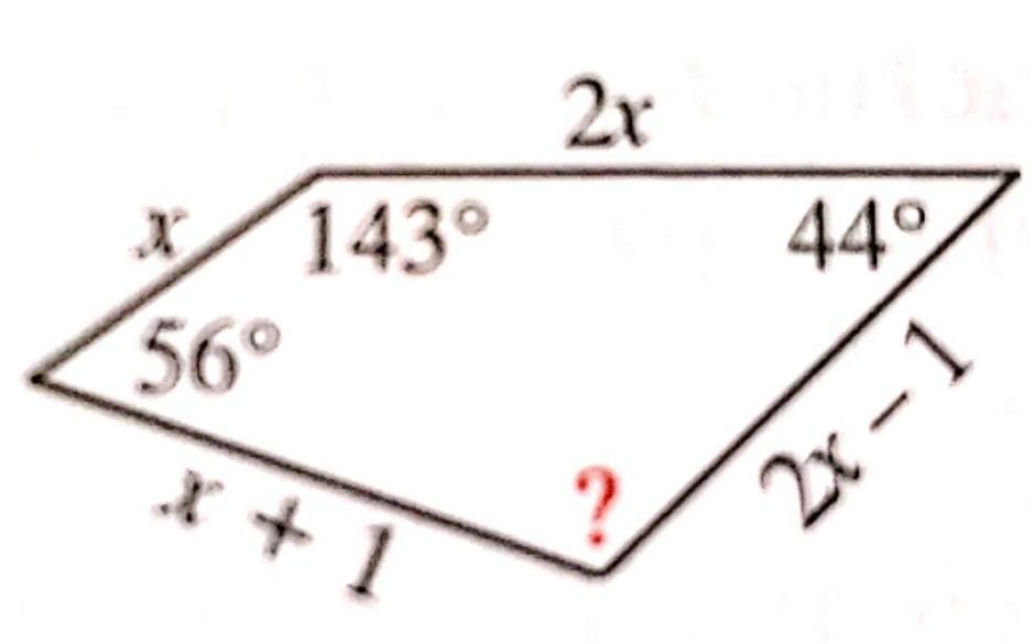 а) Вычислите величину угла четырёхугольника, обозначенного вопросительным знаком. б) Вычислите длины сторон четырёхугольника, если его периметр равен 18 см.