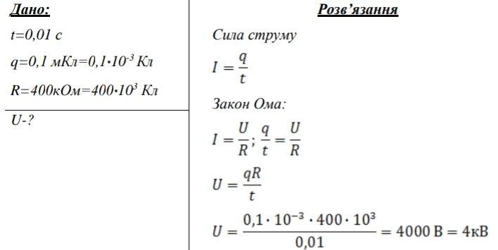 заряд 0,1мКл. Опір сухої шкіри людини становить 400 кОм. Визначити напругу
