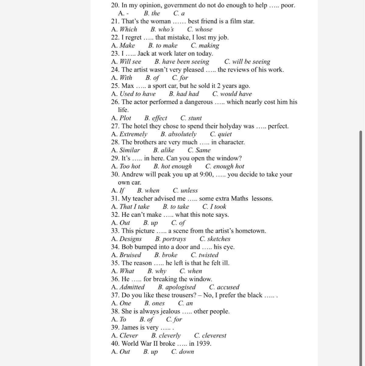 20 b 21 c 22 c 23 a 24 a 25 a 26 c 27 a 28 a 29 a 30 c 31 b 32 ... 33 c 34 a 35 b 36 b 37 a 38 b 39 a 40 a