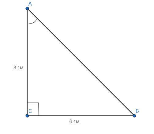 Дано прямокутний трикутник ABC, кут C=90°, катет АС=8см, катет ВС=6см, АВ-гіпотенуза. Знайти АВ, синус кута А