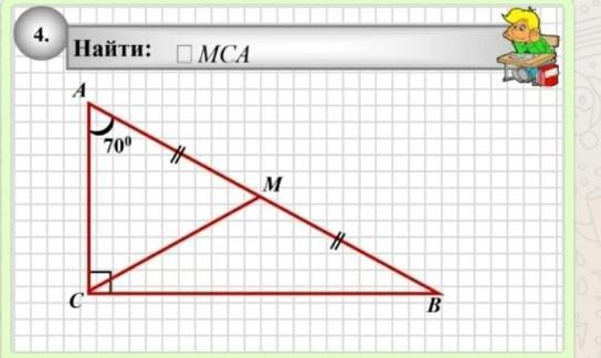 Медиана проведенная из вершины прямого угла равна половине гипот. Отсюда AM=MC. Тр-к AMC-р/б, углы при основании равны. <MCA=70