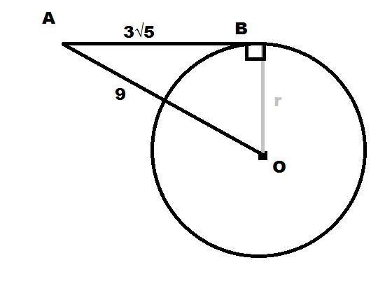 т.к. AB - касательная к окружности ⇒ r ⊥ AB ⇒ ABO - прямоугольный треугольник ⇒r=√(OB²-AB²)=√(81-45)=√36=6 (по теореме пифагора)