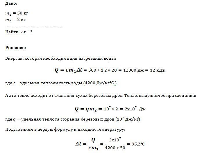 На нагревание воды массой 50 кг передано количество теплоты, полученное при сжигании сухих берёзовых дров массой 2 кг. На сколько градусов нагрелась вода? Потери тепла не учитывать.