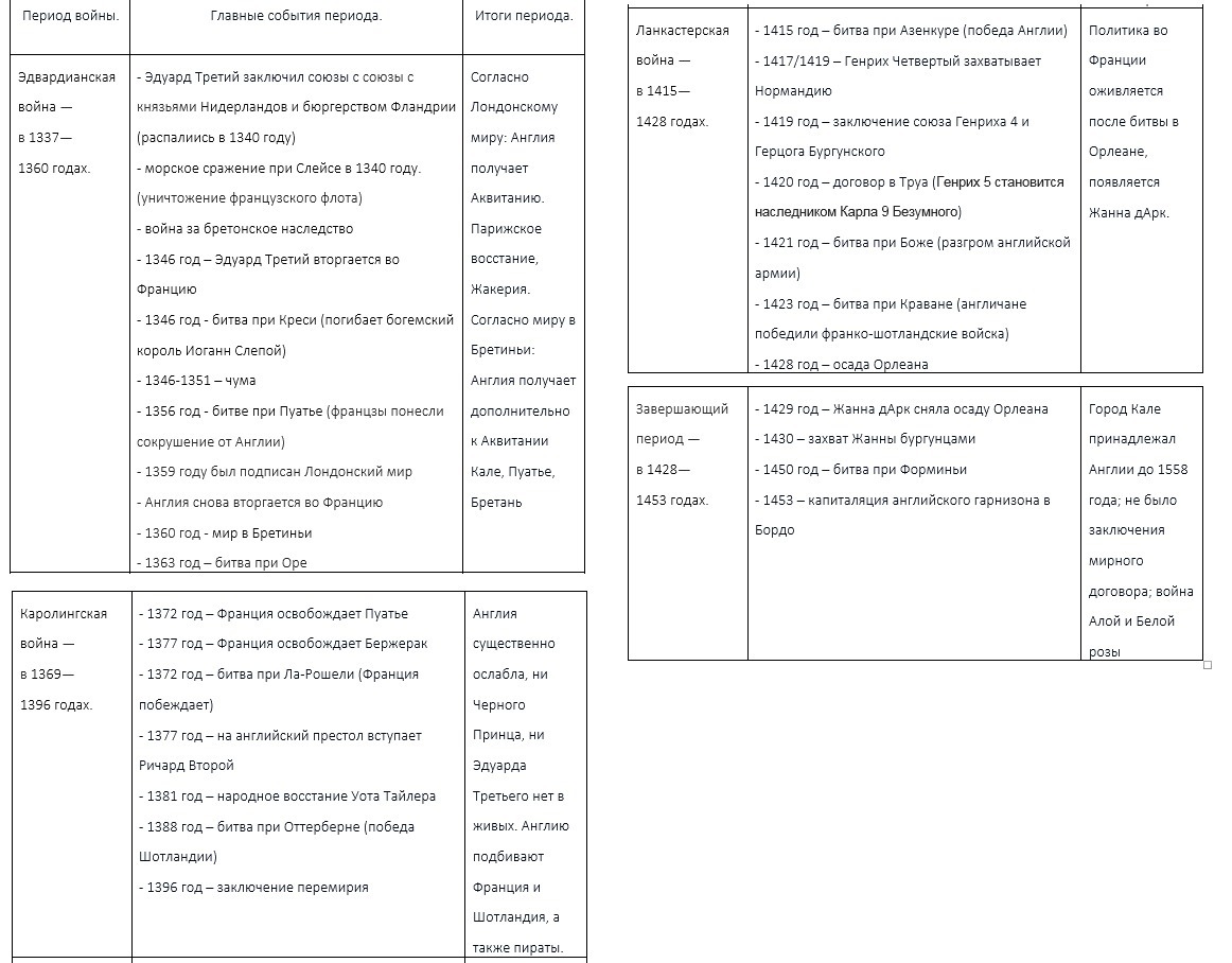 Пожалуйста, составьте таблицу по истории на тему " Столетняя Война 1337-1453 г."