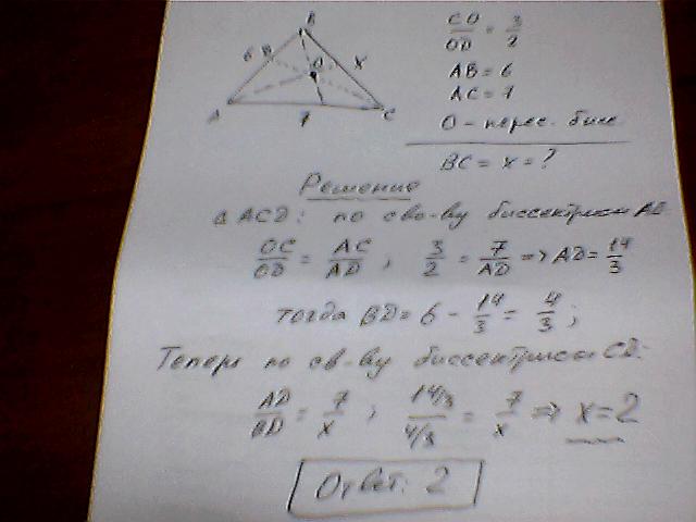 Стороны AB и AC треугольника ABC равны 6 и 7 соответственно, а биссектриса CD делится точкой O пересечения биссектрис в отношении CO:OD=3:2. Найдите оставшуюся сторону BC.