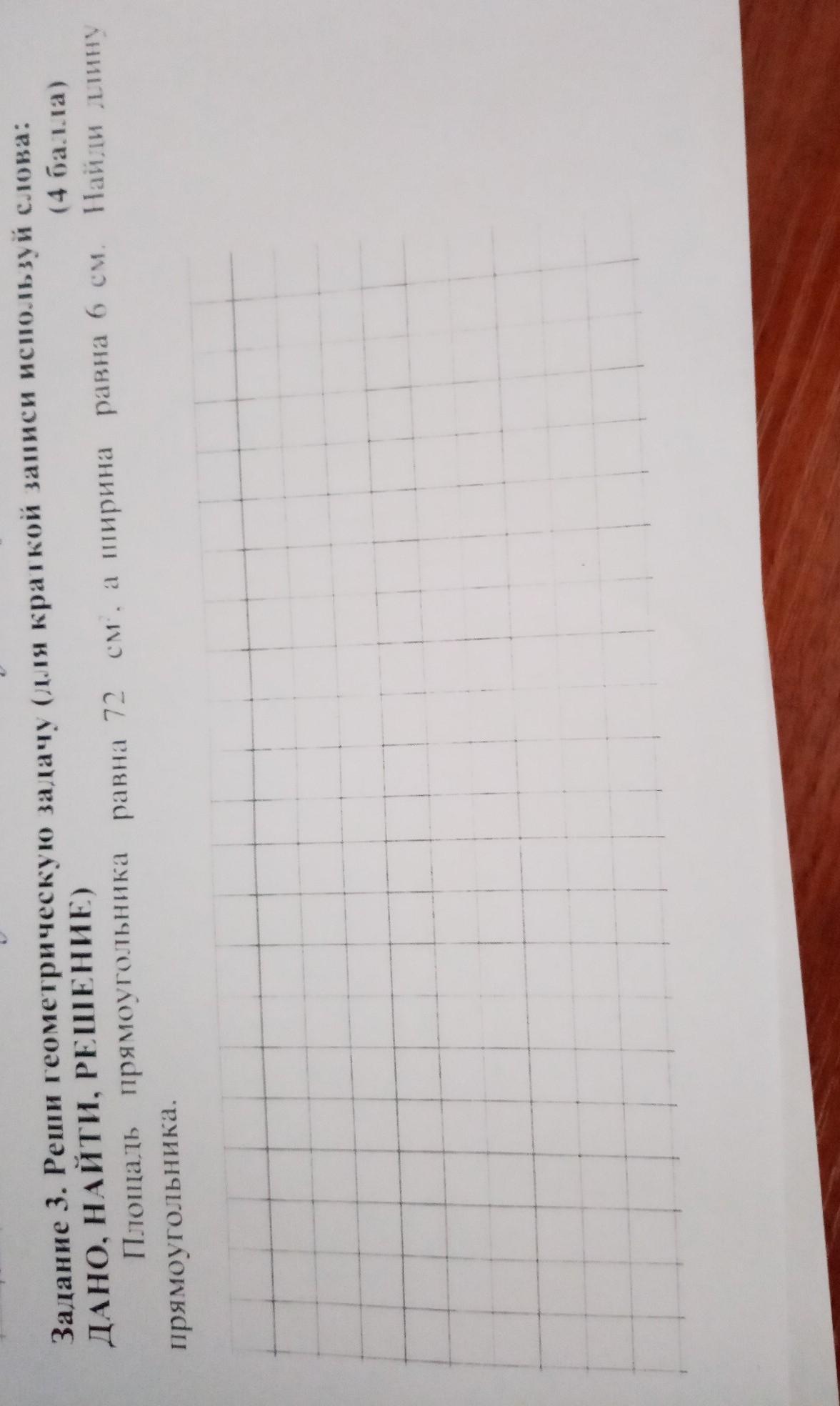 решить геометрическую задачу для краткой записи используя слова данно найти решение Площадь прямоугольника равна 72 см в квадрате а ширина равна 6 см Найди длину прямоугольника